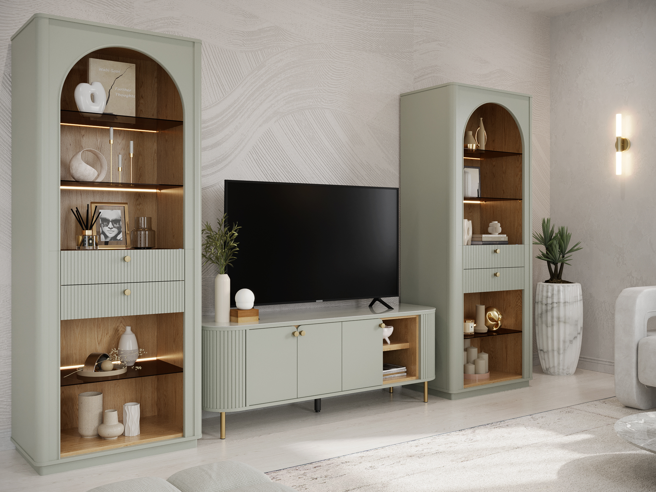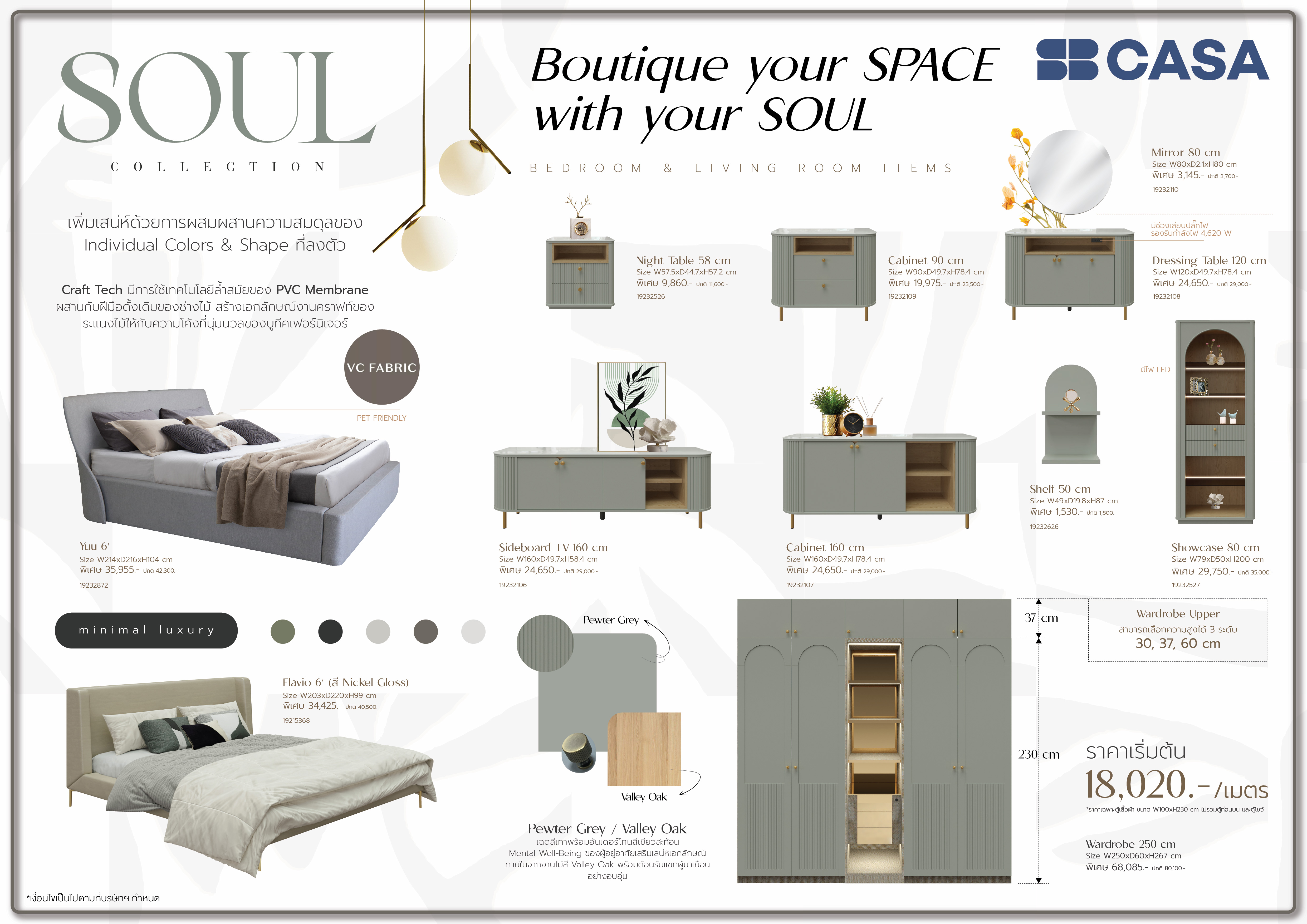 A Boutique Luxe for Your Home เพิ่มเสน่ห์น่าดึงดูดให้พื้นที่อยู่อาศัยของคุณด้วย SOUL COLLECTION ที่ผ่านการดีไซน์จากการผสมผสานระหว่างสี Pewter Grey เฉดสีเทาพร้อมอันเดอร์โทนสีเขียวที่ละเอียดอ่อน เสริมเสน่ห์เอกลักษณ์ภายในจากงานไม้สี Valley Oak เชื่อมโยงสองเฉดสีด้วยโลหะสีทองเหลืองบลัช และสะท้อนความหรูหราด้วยความเงาของกระจกใสพ่นสี ดีไซน์ผ่านงานไม้ด้วยลายเส้นอันคมชัดของความโค้งมน และดีเทลระแนงงานคราฟท์หกเหลี่ยม เป็นการเสริมสร้างความสมดุลของ Individual Colors & Shape ที่ลงตัว ที่ทำให้ได้องค์ประกอบของบรรยากาศอันนุ่มนวล สะท้อน mental well-being ของผู้อยู่อาศัย พร้อมต้อนรับแขกผู้มาเยือนอย่างอบอุ่น